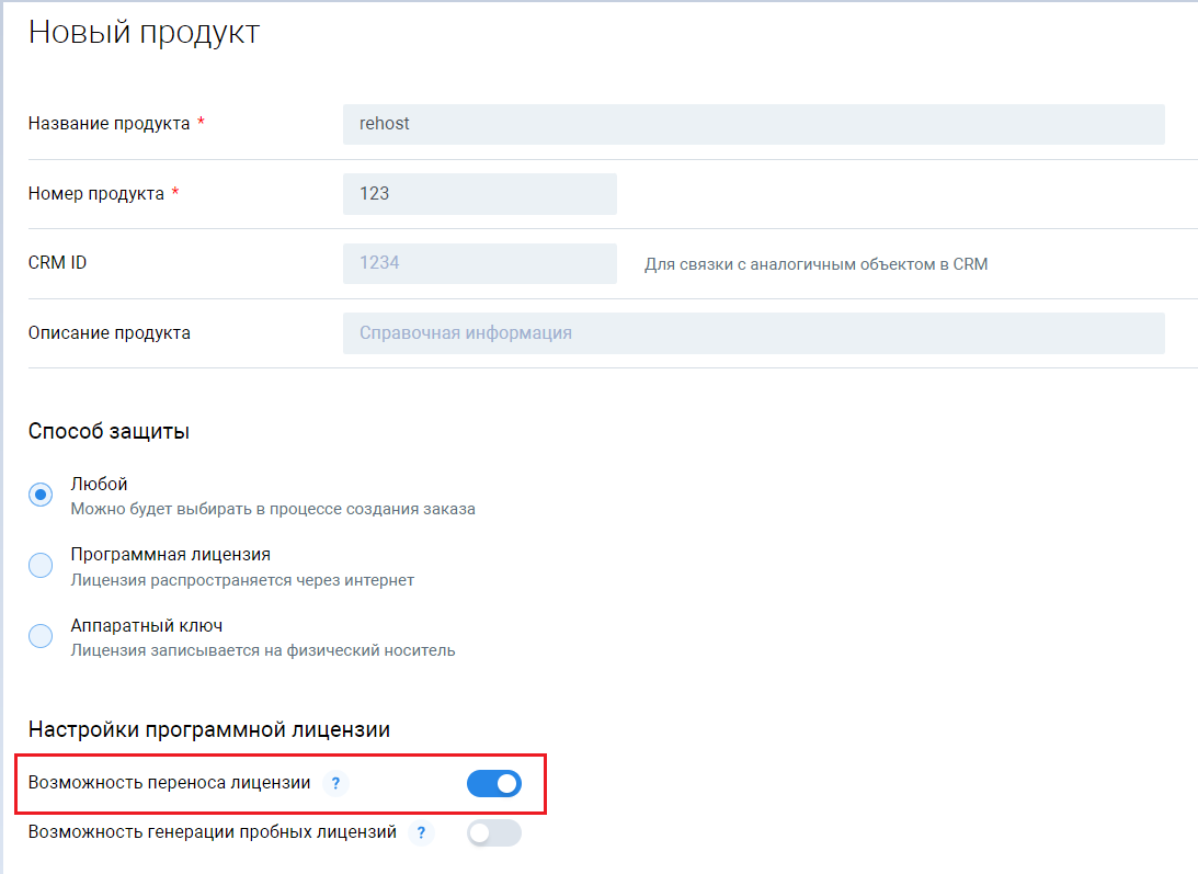 Чтобы лицензия была переносимой, нужно включить опцию переноса на уровне Продукта
