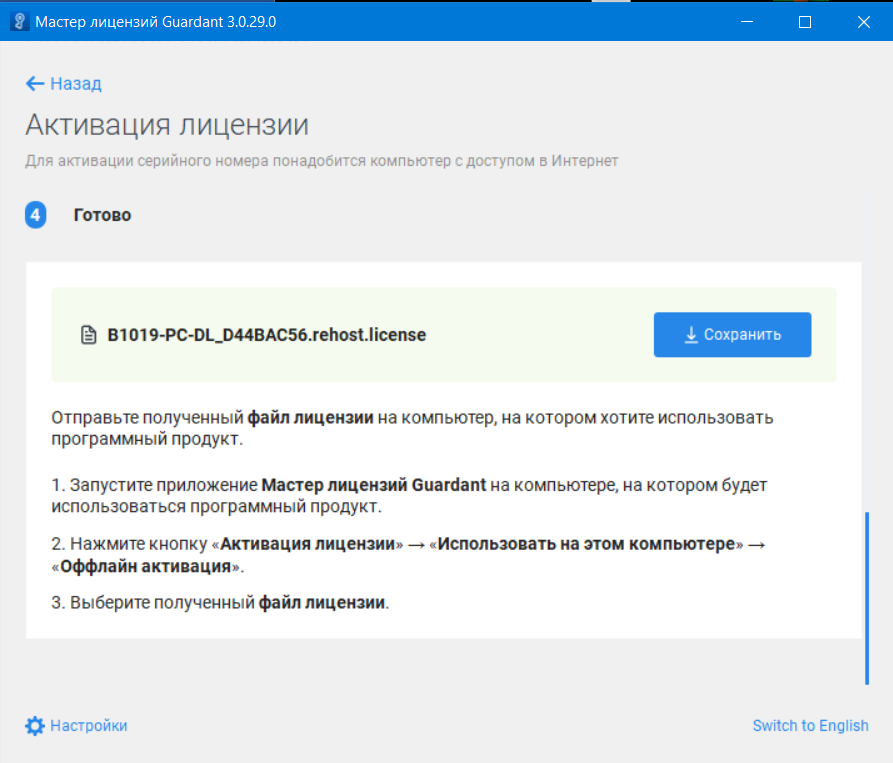 Нажать «Перенести эту лицензию», получить файл для оффлайн переноса B1019-PC-DL_D44BAC56.rehost.license и перенести его на нужный ПК