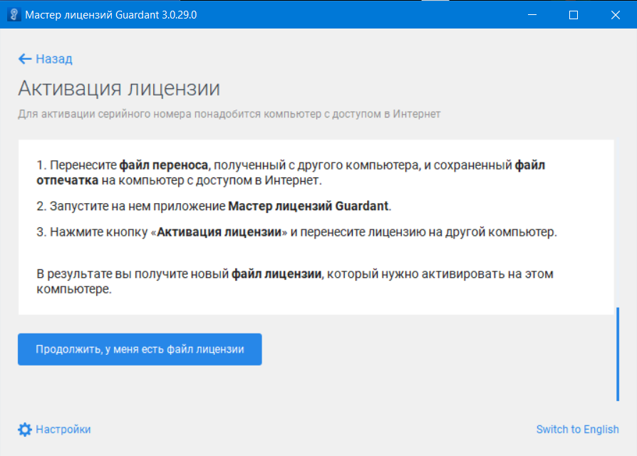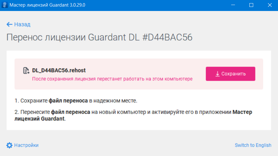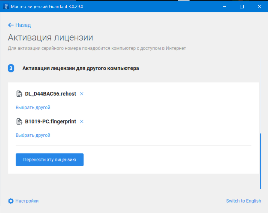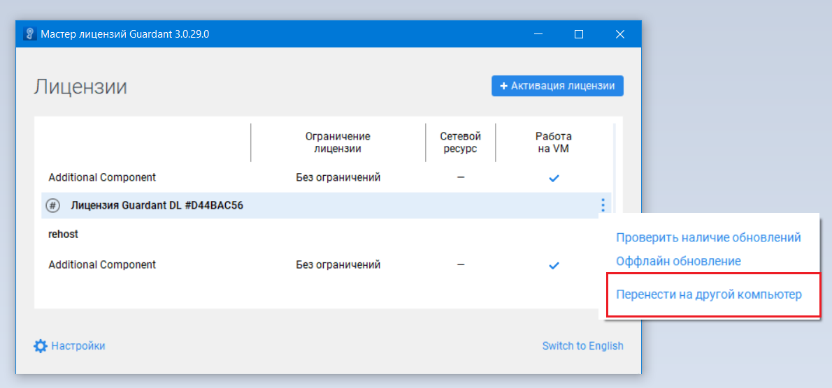 На машине, куда нужно сделать перенос, зайти в Мастер Лицензий Guardant, выбрать