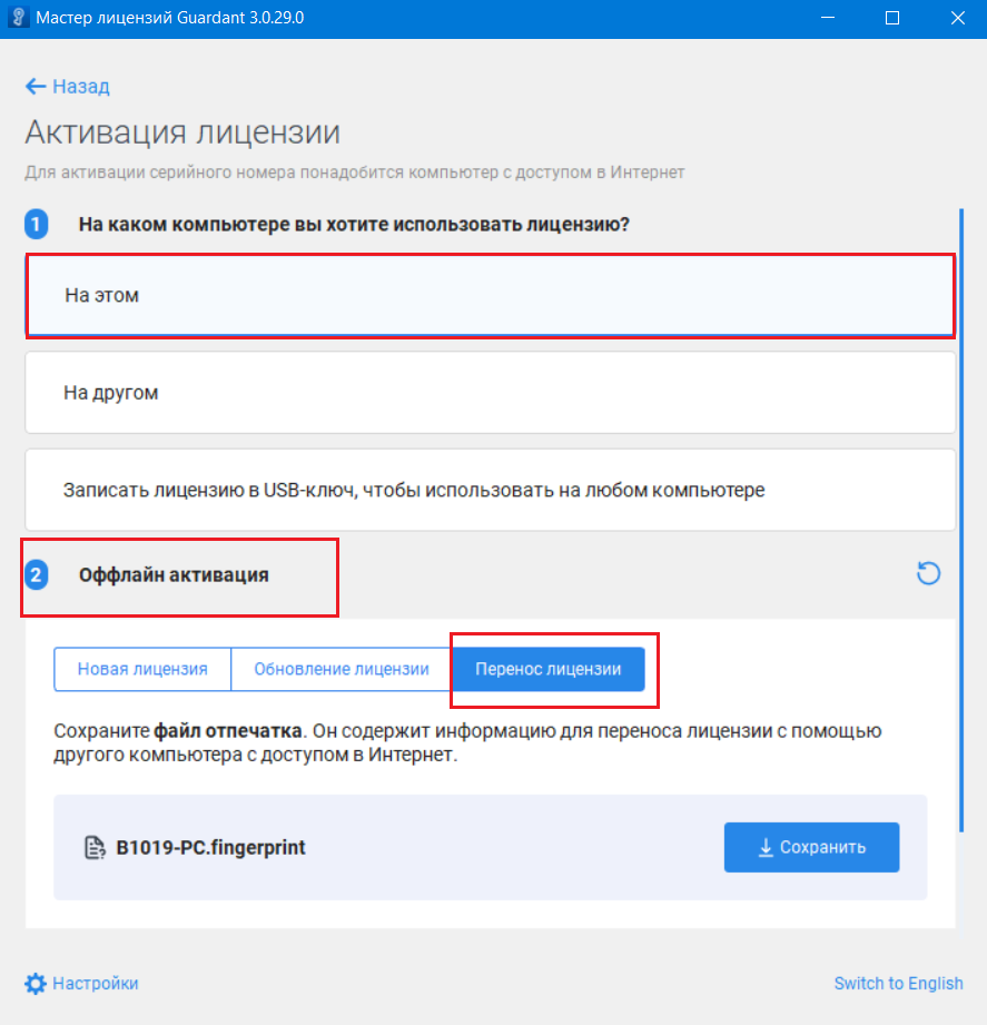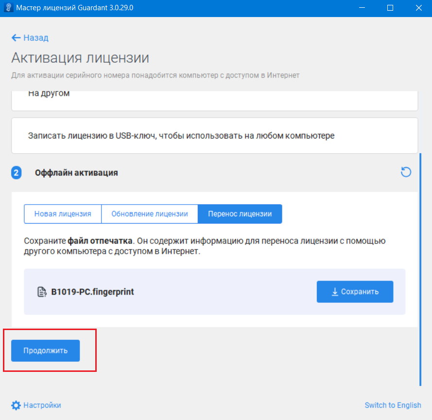Сохранить файл отпечатка B1019-PC.fingerprint (где B1019-PC - имя машины). Этот файл содержит информацию для переноса лицензии с помощью другого компьютера с доступом в интернет