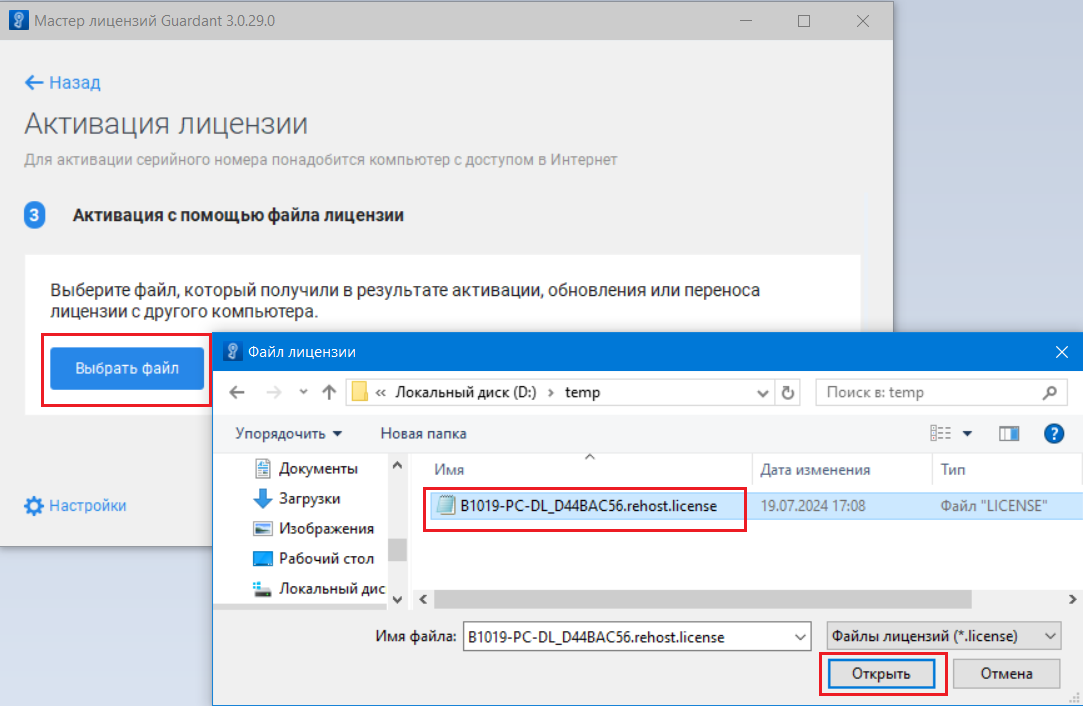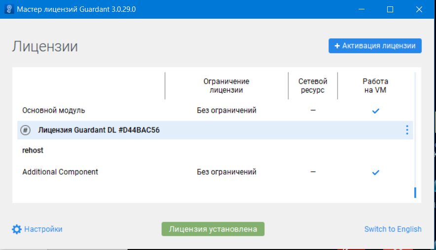 И выбрать файл, который получили на другой машине B1019-PC-DL_D44BAC56.rehost.license -> В нижней части окна Мастера лицензий появится сообщение Лицензия установлена